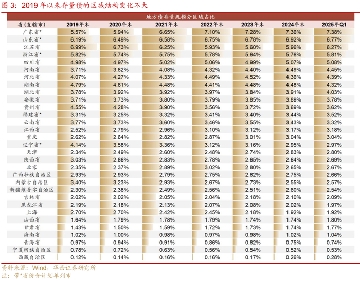 供给端,地方债内部结构也正潜移默化地形成三个特征:一是单只地方债的平均发行规模逐步上升,对于基金、券商等交易型机构而言,单只地方债发行规模提升,往往意味着债券持有方更加分散,活跃交易也更容易形成。二是存量债的期限结构明显拉长,剩余期限在10年及以上的超长债占比显著提升,由2019年底的4.1%提升至2025年一季度末的36.0%,规模达到17.8万亿元,7-10年长久期地方债占比也由13.3%小幅提升至15.2%。三是存量债的区域结构稳定,稳定存量往往也是形成交易策略的基础条件,存量地方债区域结构的稳态有利于保证区域策略的持续可行性。