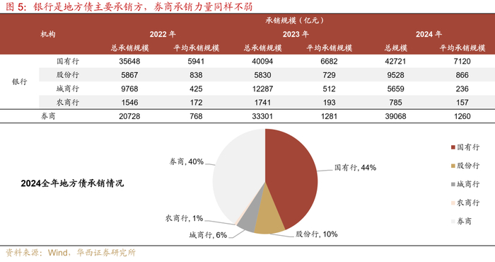 地方债托管分布结构的成因或有两个:一是银行与政府往往存在深入的业务合作机制,如地方债资金使用产生的财政支出可以转化为银行负债端的财政存款,因此银行对地方债的承接意愿往往更强。回顾近三年地方债一级发行承销情况,银行类机构占地方债发行承销的比例均在60%之上,其中国股行三年来承销占比分别为56%、49%、53%。二是银行负债成本相对较低,对资产的安全性要求较高,以配置为主,因此偏好风险更低且具备免税优势的国债与地方债,地方债通常较国债而言收益率更高,所以地方债对银行更具吸引力。
