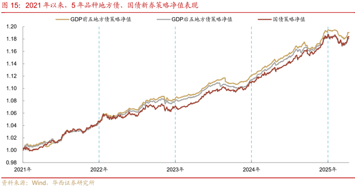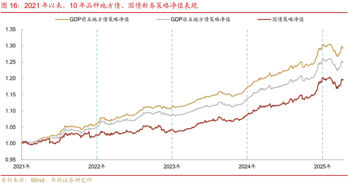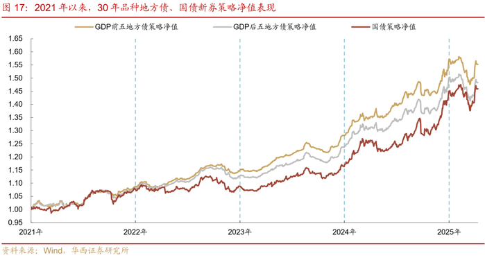 地方债的实际投资体验如何?由于地方债没有明确的活跃券概念,我们通过构建地方债、国债的新券投资策略,对地方债的投资收益特征做进一步探究。策略的时间样本选为2021年初至今,覆盖的期限为交易盘参与度更高的5年、10年、30年期品种,每两个月进行一次换仓,选择换仓当日对应期限的新券。同时,由于不同区域地方债的票息水平、利差压缩速度存在差异,我们还以2024全年GDP为参考,构建了GDP前五省份、GDP后五省份地方债投资策略,并将国债新券策略作为对照基准,衡量地方债组合的策略表现以及超额收益。