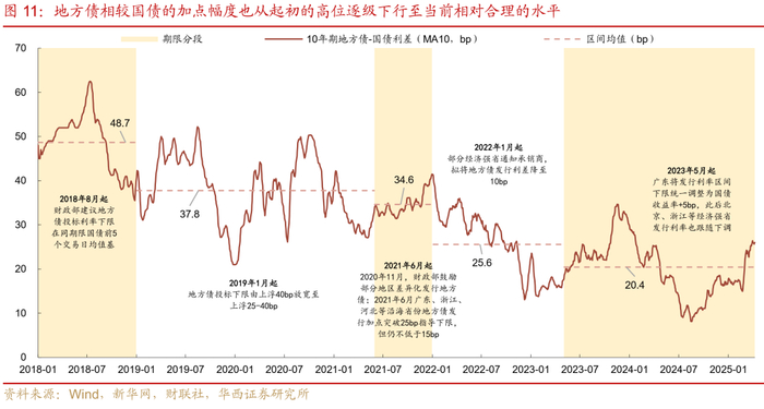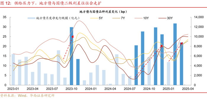 典型案例包括,其一,2023年10月特殊再融资债重启发行,地方债单月净发行规模大幅增长至1.19万亿元,远超市场预期。然而,9-10月央行MLF投放力度偏低,银行中长期资金预期不稳,承接能力较为有限,10年、30年期地方债与国债的月均利差,迅速由22bp、9bp扩张至33bp、21bp。其二,2024年8-9月地方新增专项债提速发行,单月净融资规模上升至5174、8070亿元,7年、10年期地方债与国债的月均利差由8bp、9bp提升至13bp、15bp。其三,2024年11-12月,为化解隐性债务,财政端再发力,2万亿元化债用途再融资债集中在2个月内发行,单月净融资规模达到1.19、1.05万亿元,供给期限集中在15-30年区间,相应地,30年期地方债与国债的月均利差由6bp大幅扩张至20bp。其四,2025年2-3月化债用途再融资债延续大额发行,单月净融资规模达到1.27、0.88万亿元,地方债相较国债利差再度全面扩张。