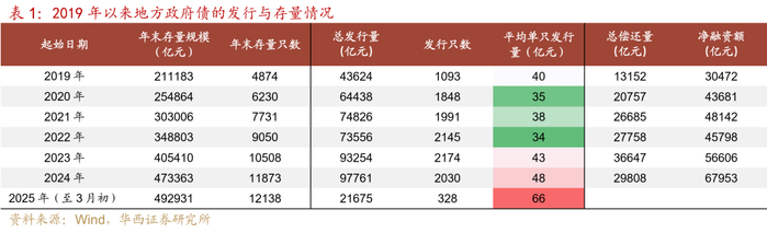 一是单只地方债的平均发行规模逐步上升。以2019-2025年作为观察期,可以发现平均单只地方债的发行规模由2020-2022年的34-38万亿元,逐渐提升至2023-2024年的43-48亿元。2025年初,随着化债专项债前置发行,平均单只地方债发行规模提升至66亿元。若以规模高于200亿元作为“大额地方债”的划分标准,从只数角度来看,2023年以前每年仅有20-40只左右的“大额地方债”供给,而2023-2024年期间,这一数字开始提升至60-90只;从规模角度来看,2023年以前,每年“大额地方债”的发行量普遍不及1万亿元,2023-2024年期间,“大额地方债”的发行量分别为1.69、2.69万亿元。