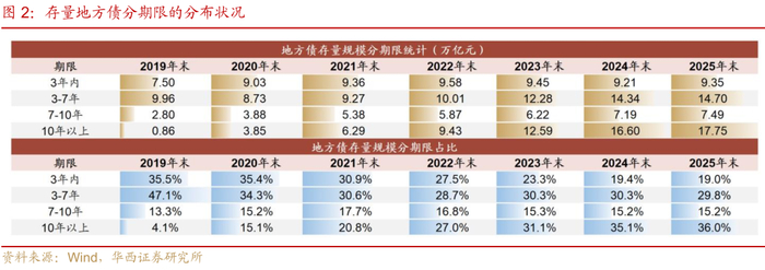 二是存量债的期限结构明显拉长。同样以2019-2025年地方债存量情况作为观测样本,不难发现,剩余期限在10年及以上的超长债占比显著提升,由2019年底的4.1%提升至2025年一季度末的36.0%,规模达到17.8万亿元,7-10年长久期地方债占比也由13.3%小幅提升至15.2%。此消彼长,3年内、3-7年地方债占比则由35.5%、47.1%降至19.0%、29.8%。