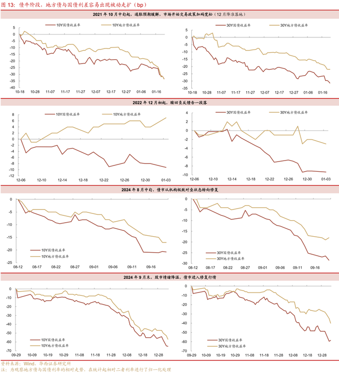 参考样本包括,其一2021年10月中旬起,通胀预期缓解,市场开始交易政策加码宽松,在此期间,无论是10年还是30年品种,国债行情的启动速度均快于30年国债,相较起初,品种利差扩张幅度在12-17bp左右。其二2022年12月初起,理财赎回负反馈告一段落,利率债率先企稳,国债收益率重新下行,地方债利率维持高位震荡,10年、30年品种利差最大扩张16bp、9bp。其三2024年8月中旬,债市从严厉监管状态转向修复,国债先行,10年、30年品种利差被动扩张幅度达7bp、11bp。此外2024年10月初,股市情绪降温,债市进入修复行情,国债的下行动力再度超越地方债。