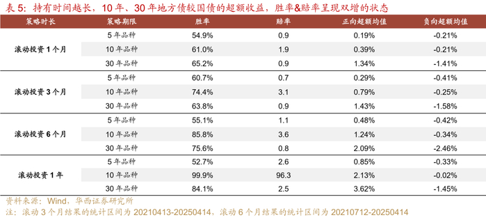 此外,我们还可以模拟投资者常规的配置习惯,将持仓期限设置为1个月、3个月、6个月、1年四个选项,并且模拟做多GDP前五省份地方债新券,做空国债新券的组合策略,观察组合策略(地方债策略超额)的胜率与赔率情况。目的是探究,给定持仓时长的前提下,任意时间介入投资,买国债更好还是买地方债更好。