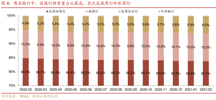 细分至具体的商业银行类型,国股行持有量最高,其次是城商行和农商行。参考截至2021年2月的托管数据(此后中债登不再更新银行分项数据),全国性商业银行、城商行、农商行地方债持仓,在商业银行持仓规模中的占比分别为83.7%、10.0%、6.0%。如果拉长时间来看,这个比例也相对稳定,大体为8:1:1。