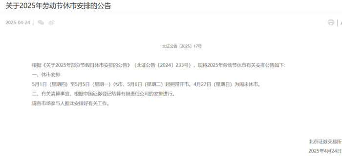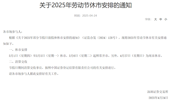 同日,深交所发布关于2025年劳动节休市安排的通知称,5月1日(星期四)至5月5日(星期一)休市,5月6日(星期二)起照常开市。另外,4月27日(星期日)为周末休市。