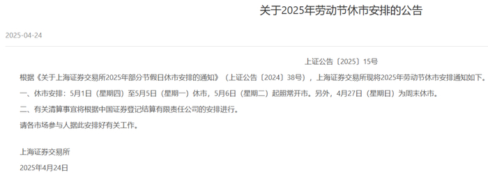 4月24日,上交所发布关于2025年劳动节休市安排的公告称,5月1日(星期四)至5月5日(星期一)休市,5月6日(星期二)起照常开市。另外,4月27日(星期日)为周末休市。