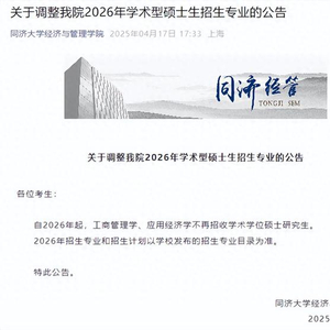 日前,同济大学经济与管理学院发布《关于调整我院2026年学术型硕士生招生专业的公告》,自2026年起,工商管理学、应用经济学不再招收学术学位硕士研究生。