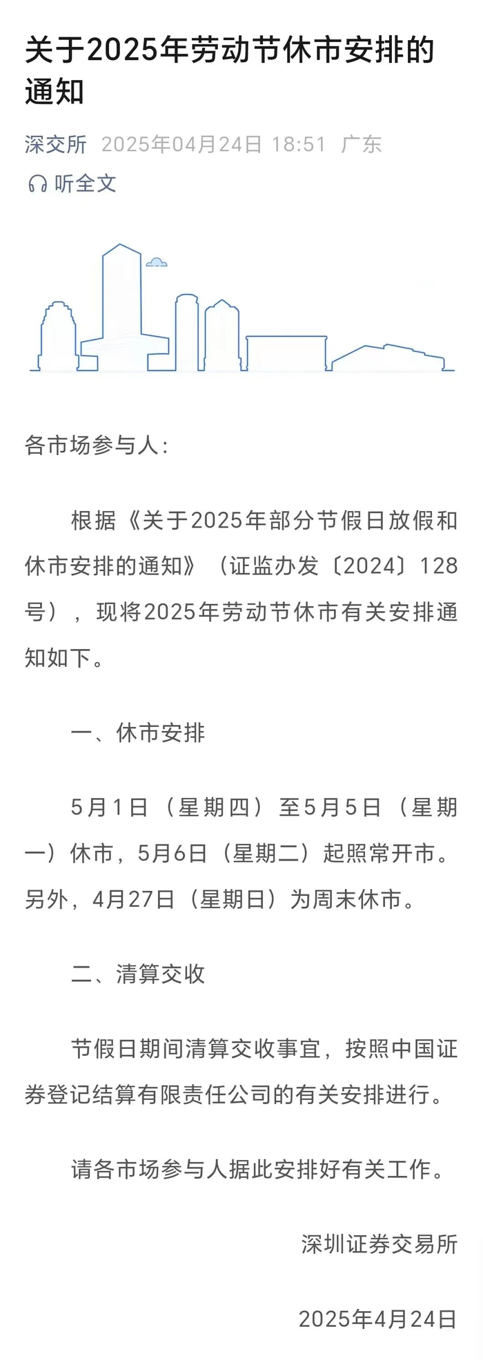 4月24日,上交所、深交所、北交所公布2025年劳动节休市安排:5月1日(星期四)至5月5日(星期一)休市,5月6日(星期二)起照常开市。另外,4月27日(星期日)为周末休市。