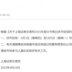 同日,深交所也发布了关于2025年劳动节休市安排的通知称,5月1日(星期四)至5月5日(星期一)休市,5月6日(星期二)起照常开市。另外,4月27日(星期日)为周末休市。