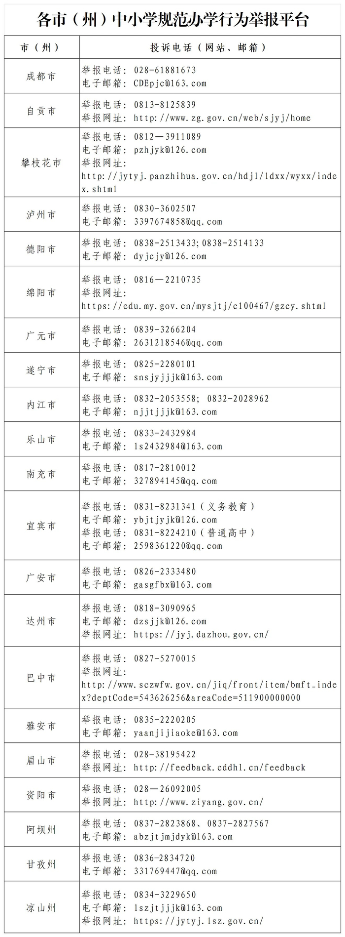四川各市(州)中小学规范办学行为举报平台公布