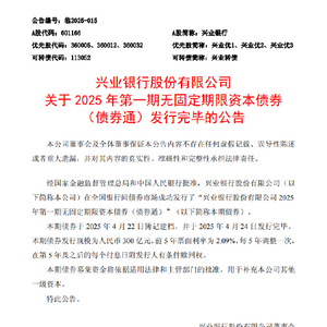 4月24日金融一线消息,兴业银行发布公告,经国家金融监督管理总局和中国人民银行批准,兴业银行在全国银行间债券市场成功发行了“兴业银行股份有限公司2025年第一期无固定期限资本债券(债券通)”(以下简称本期债券)。