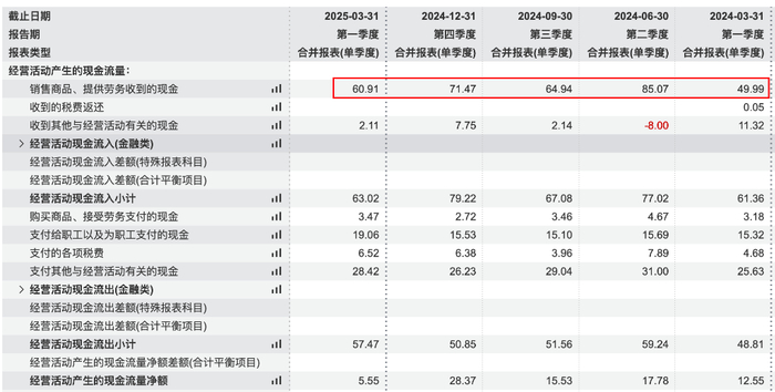 从表观利润表来看,公司经营活动产生的现金流量净额为5.55亿元,同比下降55.75%。对此,财报解释为"同期收到授权款项较多及本期研发投入增加"。但实际拆分来看,恒瑞一季度销售商品收到的现金同比仍有22%的增长,显示主业依然有着获得现金流的能力。