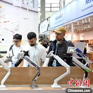 4月24日,第137届广交会的家具展区的办公桌吸引采购商参观咨询。第137届广交会第二期于4月23日至27日在广州开展,本期展会以“品质家居”为主题,线下展展览总面积51.5万平方米,展位数量24735个,参展企业10313家。中新社记者 陈楚红 摄