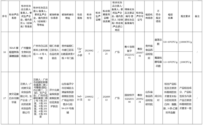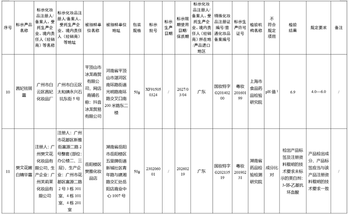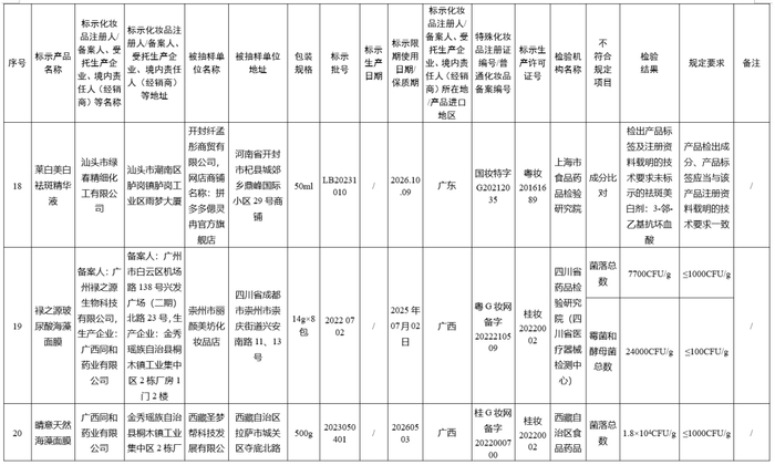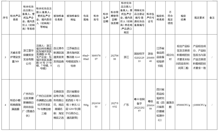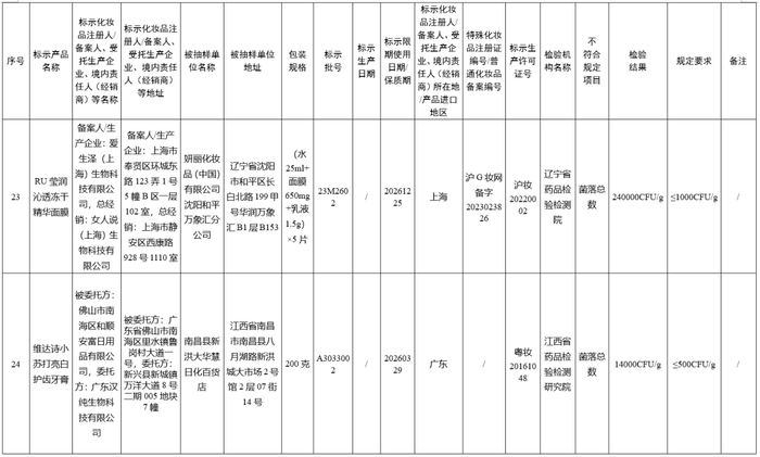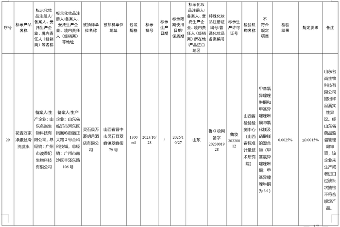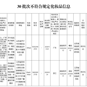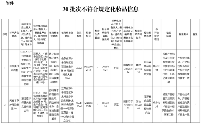 在2024年国家化妆品抽样检验工作中,经山东省食品药品检验研究院等单位检验,产品标签标示名称为北芙美白沐浴露等30批次化妆品不符合规定(见附件)。根据《化妆品监督管理条例》《化妆品生产经营监督管理办法》《化妆品抽样检验管理办法》,国家药品监督管理局要求天津、上海、江苏、浙江、山东、广东、广西等省(区、市)药品监督管理部门对上述不符合规定化妆品涉及的注册人、备案人、受托生产企业等依法立案调查,责令相关企业立即依法采取风险控制措施并开展自查整改。各省(区、市)药品监督管理部门要责令相关化妆品经营者立即停止经营上述化妆品,并依法调查其进货查验记录等情况,对违法产品进行追根溯源,发现违法行为的,依法严肃查处;涉嫌犯罪的,依法移送公安机关。