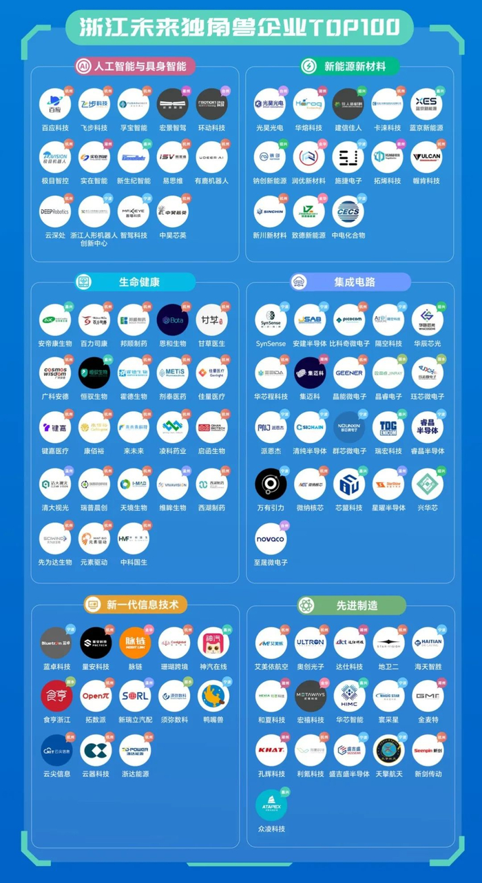浙江省“未来独角兽”TOP和“种子独角兽”TOP企业主要分布在集成电路、先进制造、人工智能与具身智能、新一代信息技术、新能源材料等领域。