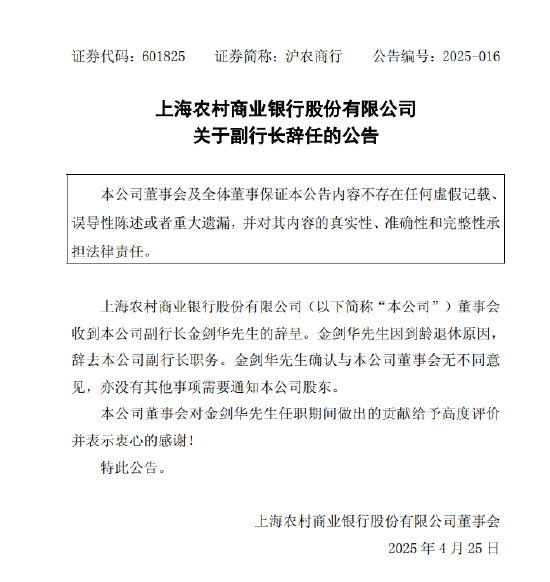 沪农商行:副行长金剑华因到龄退休原因辞任