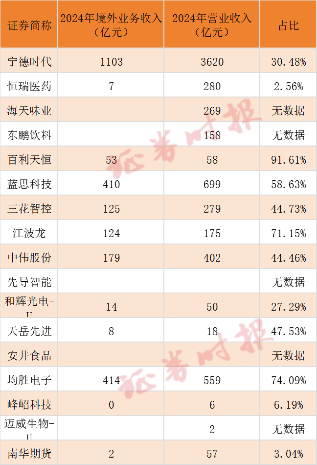 而其他一些公司,如宁德时代虽然境外收入占比仅有30.48%,但绝对值已超过1100亿元;蓝思科技、均胜电子的境外收入也都超过400亿元;同时还有三花智控、江波龙、中伟股份三家公司在境外收入也都超过百亿元。