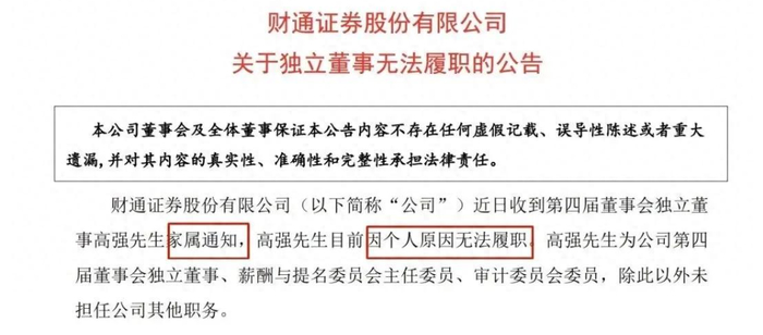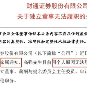 4月22日,财通证券发布公告称,收到独立董事高强家属通知,高强目前因个人原因无法履职。