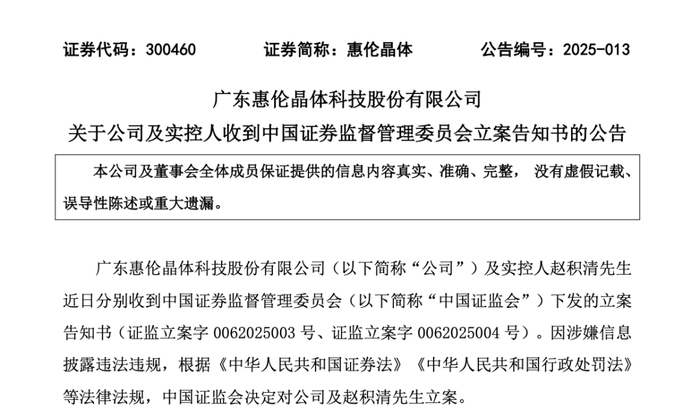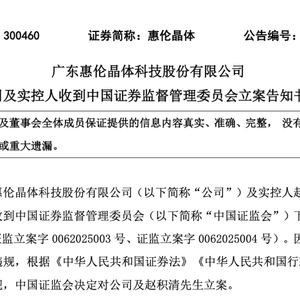 4月24日,惠伦晶体发布公告称,公司及实控人赵积清于近日收到中国证监会下发的立案告知书。因涉嫌信息披露违法违规,根据《中华人民共和国证券法》《中华人民共和国行政处罚法》等法律法规,中国证监会决定对公司及赵积清立案。
