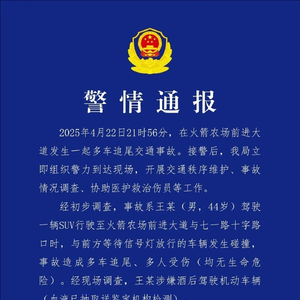 经初步调查,事故系王某(男,44岁)驾驶一辆SUV行驶至火箭农场前进大道与七一路十字路口时,与前方等待信号灯放行的车辆发生碰撞,事故造成多车追尾、多人受伤(均无生命危险)。经现场调查,王某涉嫌酒后驾驶机动车辆(血液已抽取送鉴定机构检测)。