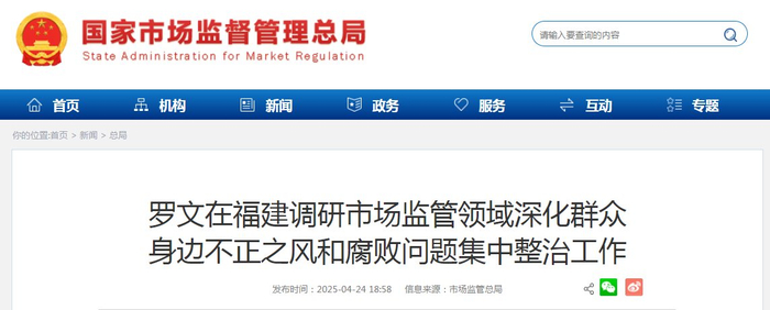 4月22日至23日,市场监管总局党组书记、局长罗文在福建调研市场监管领域深化群众身边不正之风和腐败问题集中整治工作。