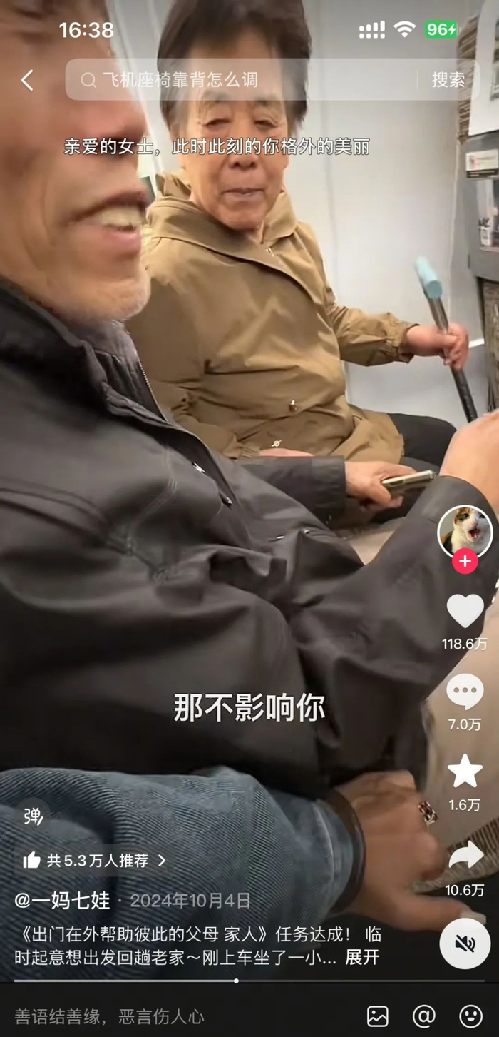 去年10月6日,北京一女生在社交媒体发视频《出门在外帮助彼此的父母 家人》任务达成!视频中,女生主动帮助前排老人调整座椅靠背,称“我怕你们不舒服,你们坐着,我帮你们调整”,这一视频也引发无数网友点赞。