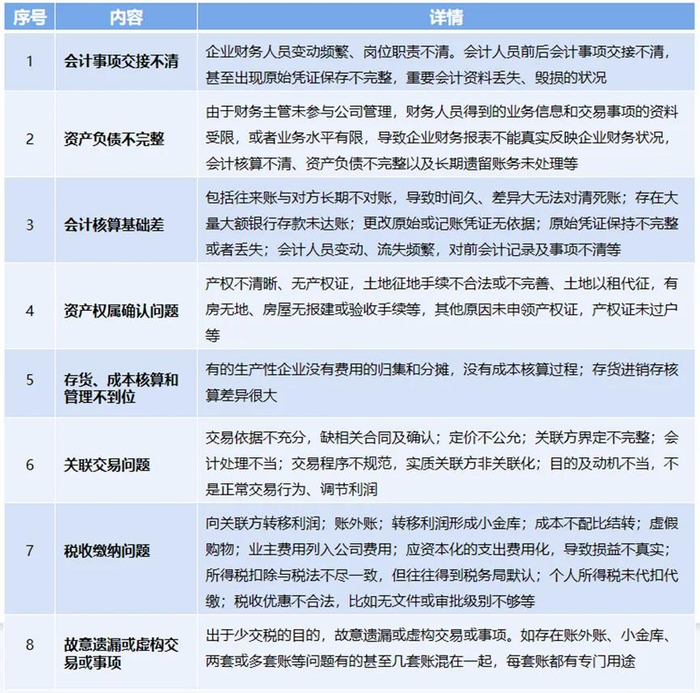 9 | 财务规范性问题 | 交易依据不充分,缺乏相关合同及确认,会计处理不当等 |