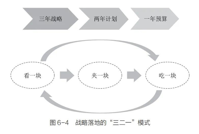 再完美的战略,都需要落地并转化为结果。我把这种战略落地的方式称为“三二一”模式,即三年战略,两年计划,一年预算(见图 6-4)。如果你的预算只考虑“当年投入,当年产出”,两年业务计划就无法完成,战略实施就会脱节,预算永远都衔接不上三年战略。