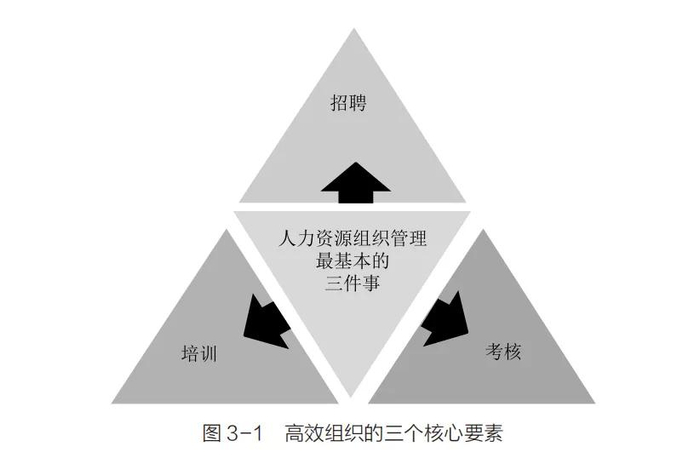 很多企业都在讲效率提升,其实它们忽略了一个核心问题:效率提升并非依赖于人力资源的数量优化,而是深深根植于一个精心构建的组织体系中。打造组织就像盖房子一样,核心是把根基打好。一个高效组织的根基应该包括三个核心要素,即招聘、培训和考核(见图 3-1)。