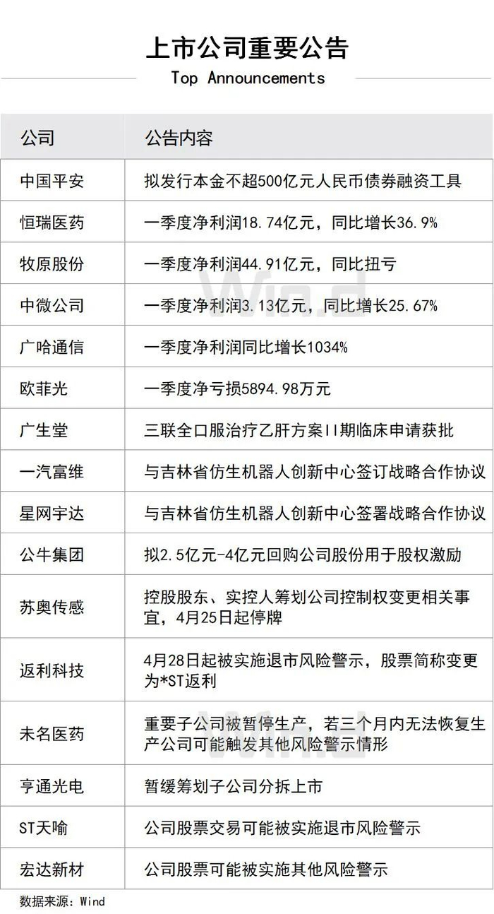 3、央行公告称,4月25日将以固定数量、利率招标、多重价位中标方式开展6000亿元MLF操作,期限为1年期。据了解,本月有1000亿元MLF到期,此次操作实现净投放5000亿元,显示出央行在当前阶段继续加大流动性支持力度,稳定市场预期。