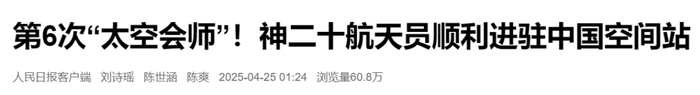 北京时间2025年4月25日1时17分,在轨执行任务的神舟十九号航天员乘组顺利打开“家门”,欢迎远道而来的神舟二十号航天员乘组入驻中国空间站,这是中国航天史上第6次“太空会师”,也是两名指令长时隔3年后再次相聚“天宫”。随后,两个航天员乘组拍下“全家福”,共同向牵挂他们的全国人民报平安。