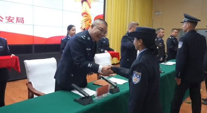 经洛浦县公安局党委研究,对主动请缨下井救人的布帕太姆·阿布杜喀迪尔破格从七级晋升至五级,同时对其余优秀辅警进行了授衔。