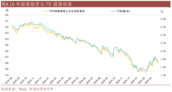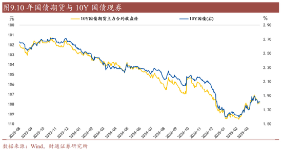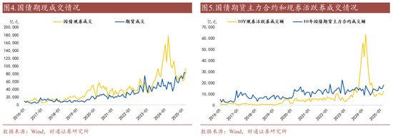 成交规模方面,当前期货和现货市场交易规模整体相近,期货交易更加集中于单一标的。2025年3月,国债期货合计成交约8.2万亿元,国债现券合计成交约9.4万亿元。对比现券活跃券和期货主力合约,期货主力合约成交额更高,2025年3月,10年期国债期货主力合约成交额约1.8万亿元,现券活跃券成交额约1.3万亿元。