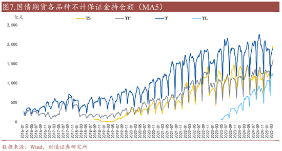 存量规模方面,理论上国债期货的市场整体持仓规模没有上限,而现券的存量规模是确定的,导致现券市场可能受到债券供求情况的扰动,比如央行此前提及债券供给不足导致收益率曲线部分点位定价不充分的情况。截至4月24日,国债期货持仓规模(无杠杆)合计约6875亿元,远低于国债现券余额(约36万亿元)。