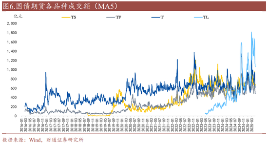 对于国债现券,2023年成交额开始持续放大,并在2024年一季度达到峰值,引发央行关注;对于国债期货,成交额持续缓慢增加,没有出现类似的激增。当前30年国债期货整体成交最活跃,其次是10年国债期货、2年国债期货和5年国债期货。