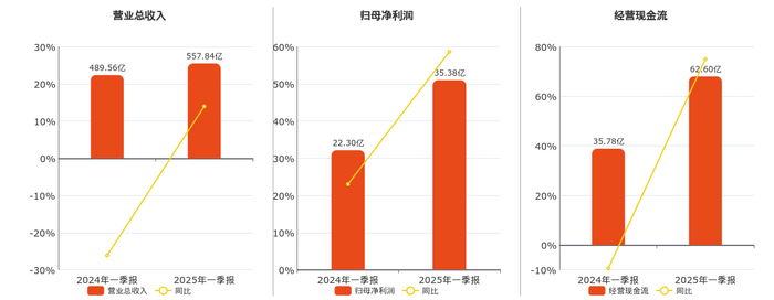 公司营业总收入为557.84亿元,较去年同报告期营业总收入增加68.28亿元,同比较去年同期上涨13.95%。归母净利润为35.38亿元,较去年同报告期归母净利润增加13.10亿元,实现2年连续上涨,同比较去年同期上涨58.78%。经营活动现金净流入为62.60亿元,较去年同报告期经营活动现金净流入增加26.84亿元,同比较去年同期上涨75.06%。