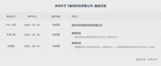 根据工商变更,近日,艾飞智控完成Pre-A轮融资,投资方为深圳市华海润达科技有限公司。2024年9月,艾飞智控完成天使+轮融资,由宽愉资本独家投资。2023年9月,其完成天使轮融资,投资方为君盛投资。