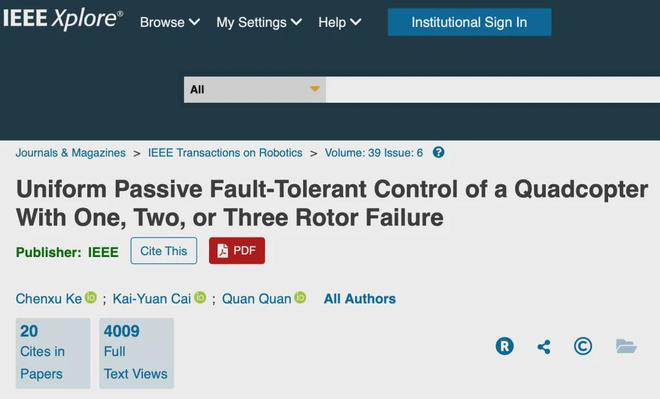 据北京航空航天大学微信公众号14日消息,该校自动化科学与电气工程学院可靠飞行控制团队在无人机容错控制技术方面取得重要进展,让四旋翼飞行器三个旋翼失效、依旧无拘飞翔。相关成果近期发表于机器人领域顶级期刊《IEEE Transactions on Robotics》。