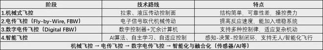 飞控系统的技术路线演进,是随着航空技术的发展逐步从机械化走向数字化、再迈向智能化的过程,体现出从“辅助人控”向“部分替代”甚至“全面自主”的控制逻辑转变。