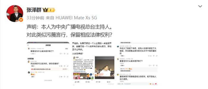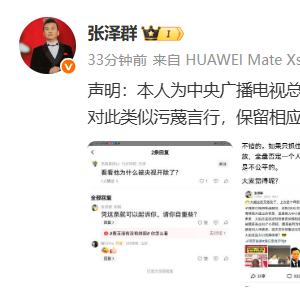 近日,有网友称主持人张泽群被央视开除,4月25日,@张泽群 发文回应造谣。张泽群写道:“声明:本人为中央广播电视总台主持人。对此类似污蔑言行,保留相应法律权利?”