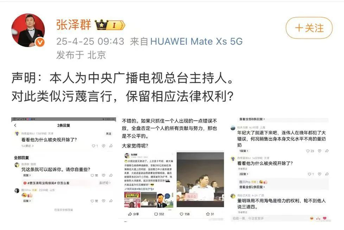 近日,有网友称主持人张泽群被央视开除,4月25日,张泽群愤怒发文反驳。