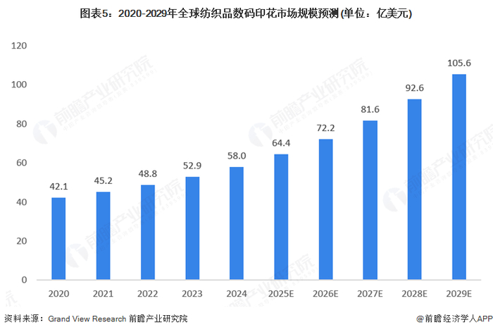 数码纺织品印花允许高水平的定制,包括个性化的设计、颜色和图案,使其成为符合上述市场趋势的理想选择。根据Grand View Research数据,2020-2024年全球纺织品数码喷墨印刷市场规模逐年增长,2024年增长至58.0亿美元。2025-2029年全球纺织品数码印花市场规模年复合增速约12.7%,到2029年全球纺织品数码印花市场规模约105.6亿美元。