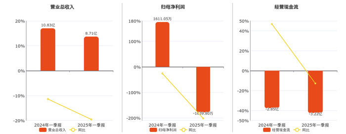 公司营业总收入为8.71亿元,较去年同报告期营业总收入减少2.12亿元,同比较去年同期下降19.58%。归母净利润为-1639.80万元,较去年同报告期归母净利润减少3250.85万元,同比较去年同期下降201.78%。经营活动现金净流入为-3.22亿元,较去年同报告期经营活动现金净流入减少3657.79万元。