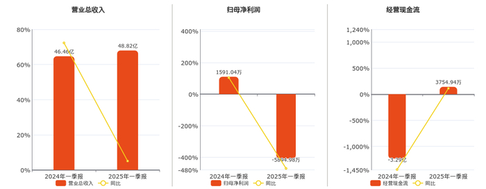 公司营业总收入为48.82亿元。归母净利润为-5894.98万元,较去年同报告期归母净利润减少7486.02万元,同比较去年同期下降470.51%。经营活动现金净流入为3754.94万元。