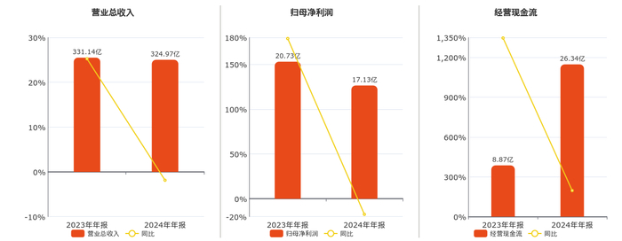 公司营业总收入为324.97亿元,在已披露的同业公司中排名第2,较去年同报告期营业总收入减少6.16亿元,同比较去年同期下降1.86%。归母净利润为17.13亿元,在已披露的同业公司中排名第2,较去年同报告期归母净利润减少3.60亿元,同比较去年同期下降17.36%。经营活动现金净流入为26.34亿元,在已披露的同业公司中排名第3,较去年同报告期经营活动现金净流入增加17.47亿元,实现2年连续上涨,同比较去年同期上涨196.86%。