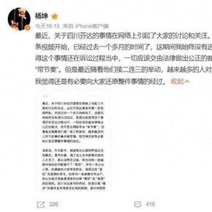 杨坤称“四川芬达”早已透支了最后的信任。“如果今天我撤诉,明天他们是否会用‘道歉后被追责’的剧本继续编排我?这种反复无常的操作,早已透支了我最后的信任。所以这次,即便我看到网络上有很多声音让我应该‘和解’,否则就是‘小肚鸡肠’,或者觉得‘赢了又能怎样’‘不如接住这波流量’等声音。我依然认为,这个事情已经不是一个单纯的娱乐事件了,我想守住的也不只是个人名誉,更是作为公众人物应有的底线。”
