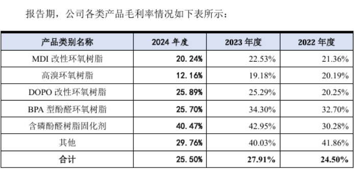 详细来看,公司主营业务各产品毛利率2024年除了DOPO改性环氧树脂增长外,其他清一色下降。
