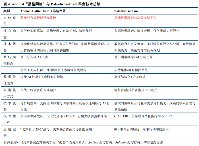 2)基础平台层:Anduril“晶格网格”、Palantir Gotham平台等打造智能战场的中枢神经系统。为实现“整合卫星、无人机、武器平台以及其他感知设备等多层次、多来源的数据获取手段,构建起一个全方位、实时化的智能战场感知神经网络”这一目标,基础平台层的核心在于具备强大的数据获取、处理、融合与反馈能力,从而形成具备认知与自适应能力的信息中枢体系。在该体系中,Anduril的“晶格网格”(Lattice Grid)与Palantir的Gotham平台分别扮演前沿感知与后端决策的关键角色,构建了战场智能化体系的“感觉-认知-响应”闭环机制。