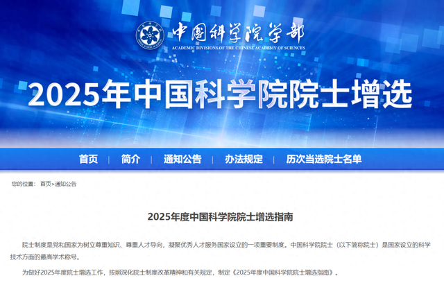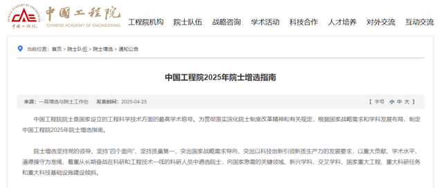 据中国科学院和中国工程院官网4月25日消息,2025年两院院士增选指南公布,两院院士增选工作正式启动。